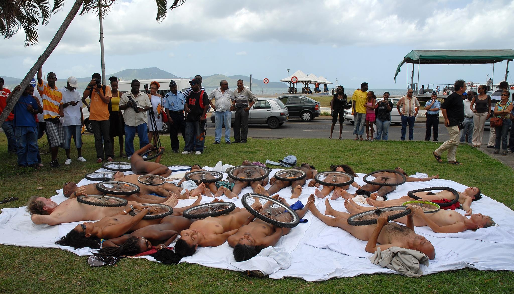 En protestation contre la montée de la violence explicitée par le drame d’un jeune garçon tué par un autre lors de la fête de la musique en 2007 à Fort de France en lien avec un vol de vélo, Julie Bessard a proposé à plusieurs artistes une performance sur la Place de la Savane. Chacun des participants apportait une roue de bicyclette. Réunis sur la Place ils se sont déshabillés et couchés sur un linceul blanc en tenant sur leurs corps une roue de bicyclette. Cette performance par sa portée sociale, par l’émotion vive de l’évènement auquel elle faisait référence, a marqué durablement l’esprit des présents.