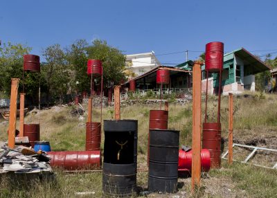 Construction-Dconstruction-reconstruction. La méthode, miraculeuse, consiste à recueillir, collecter, récupérer, amasser, agglomérer, réunir, séparer, ordonner, ranger, classer, dispatcher, assembler, des-assembler, désunir puis organiser, structurer. Amener les objets, les résidus, les rebus, les éléments, le végétal, vers un autre phrasé de vie. N’y-a-t’il pas dans cette manière le désir sous-jacent d’introduire de la cohérence, de la cohésion, du sens, de la structuration à travers l’acte d’hybridation des éléments, des composantes multiples, choisies et dé-choisies? N’y-a-t’il pas un lien étroit et suggéré entre l’acte de donner re-naissance et l’idée invisible – le projet intime – de réunir les êtres, les idées, les objets dans une unité, une cohérence de l’ensemble? N’énonce-t’il pas d’ailleurs une volonté manifeste de s’inscrire dans une «Nation-Caraïbe», comme il l’appelle de ses voeux, de construire ce lieu politique commun, d’hybrider donc les projets singuliers vers un devenir collectif? N’y-t’il pas un va-et-vient incessant entre l’individualité et le vivre-ensemble, en l’occurence ici, le «Ansanm, Ansanm» dans l’acte d’hybridation et d’assemblage des objets.