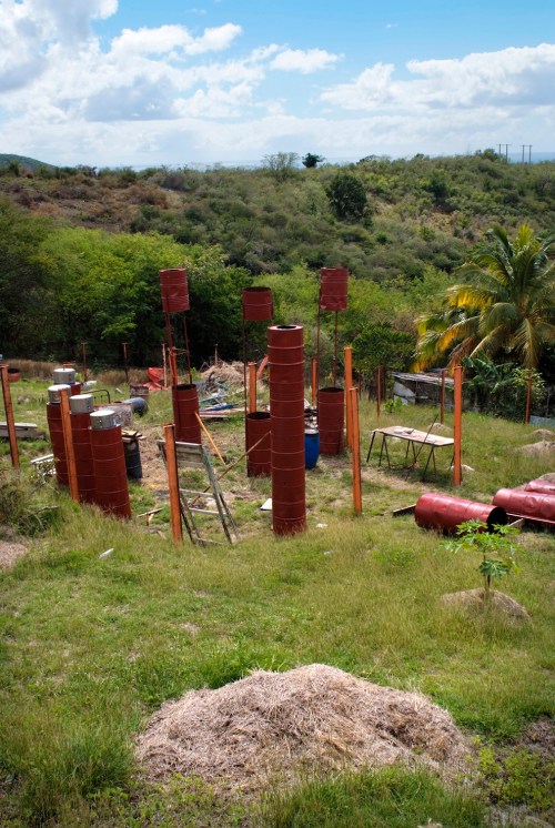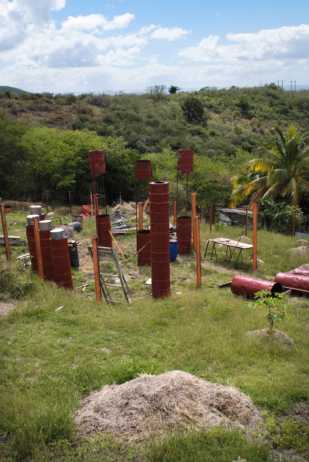 Le travail de BERTIN est sérieux, très sérieux. Comme un ouvrier, il vient tous les matins à son jardin-atelier, ce lieu dans lequel naît la création, celle d’une esthétique caribéenne. En effet, tout le jardin est organisé en ateliers où sont convoqués des acolytes bénévoles : le feu, le soleil, la pluie, les termites ! Et bien sûr, des lessives, en particulier une grande cuve d’eau savonneuse dans laquelle baignent des pieds de table tournés, destinés à une énigmatique œuvre.