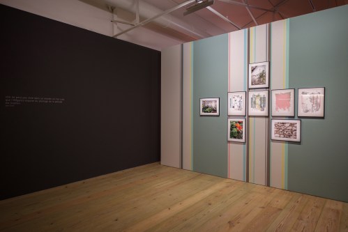 - Adler Guerrier – Untitled, installation photo, peinture. Adler ouvre l’exposition en nous projetant directement dans les questions de mémoire, présence et absence. Haïti, qu’on devine présent dans les photos n’est pas nommé et est encadré et s’oppose aux rayures aux couleurs caractéristiques de la marque de peinture Benjamin Moore très courante aux Etats Unis. Cette double référence positionne d’emblée l’idée du mix et de la diaspora. L’œuvre tout en fragments parle d’un lieu qui pourrait être n’importe où (entre ville et campagne, une sorte de banlieue)… mais sur les photos c’est bien Haïti que l’on voit. Sur certaines photos des images contemporaines de lieux urbains combinées avec des sortes de taches semblent à la fois actuelles et anciennes. D’autres ont été oblitérées par la couleur. Ce sont des petits bouts de mémoire mélangés, des liens qui se reconstituent dans le souvenir.