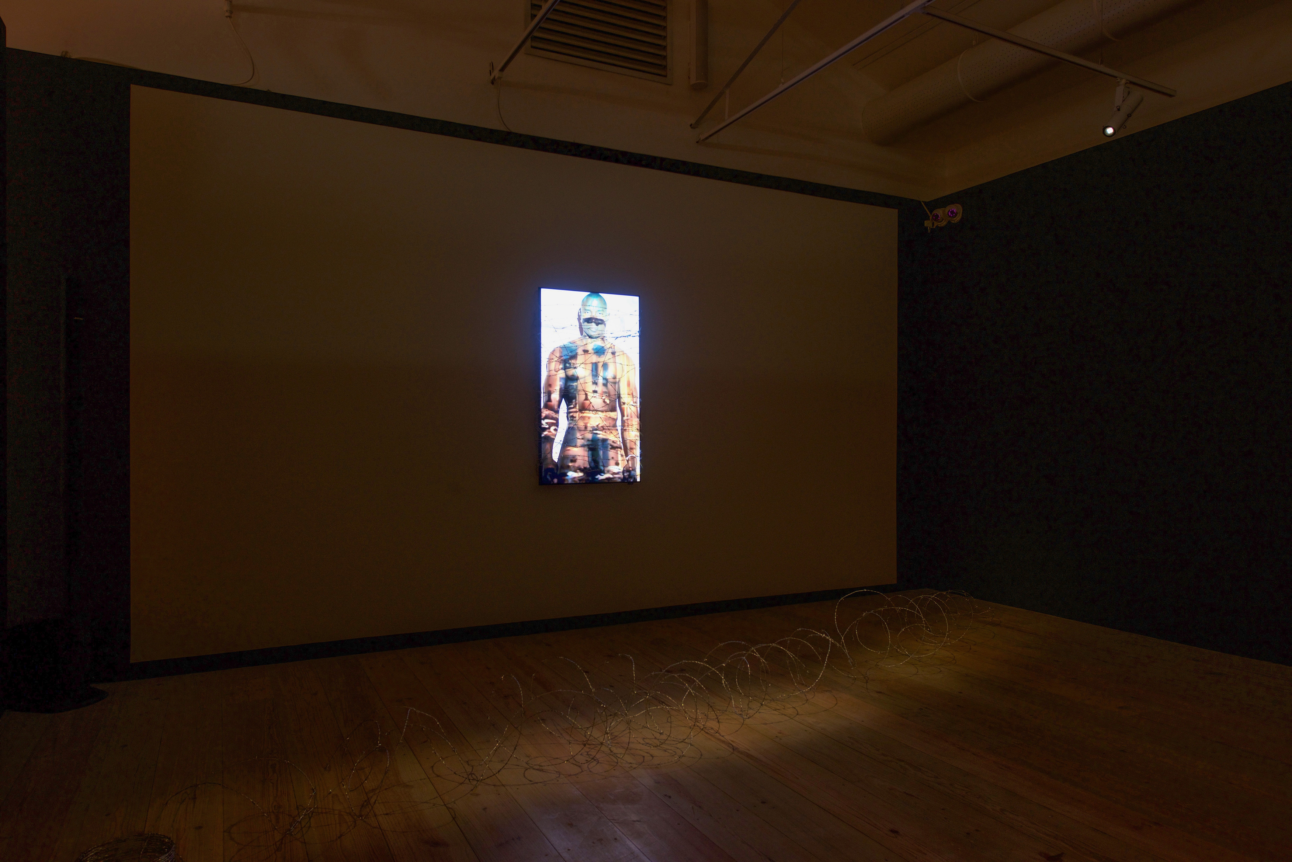 - Maksaens Denis – l’installation vidéo Tragédie tropicale. Très osée dans le contexte haïtien où l’exposition d’un nu frontal masculin est particulièrement tabou. En superposant différents niveaux d’images, l’artiste apporte une réflexion sur la réalité et la spiritualité, les croyances, les tabous, la politique et le quotidien. Ici comme toujours chez Maksaens, l’artiste parle d’un sujet qui le touche et le préoccupe. Pour cela il utilise le son et l’image intimement imbriqués. Dans cette Tragédie tropicale, tandis que la bande son chante “Révolution will be not televised!” l’image du corps de l’artiste est recouverte d’inscriptions et d’autres images, dont certaines très dérangeantes, comme du sang, des stigmates, des attaches coupants… à cela s’ajoute la présence des fils barbelés sur le sol. Et le tout construit une œuvre de grande épaisseur.