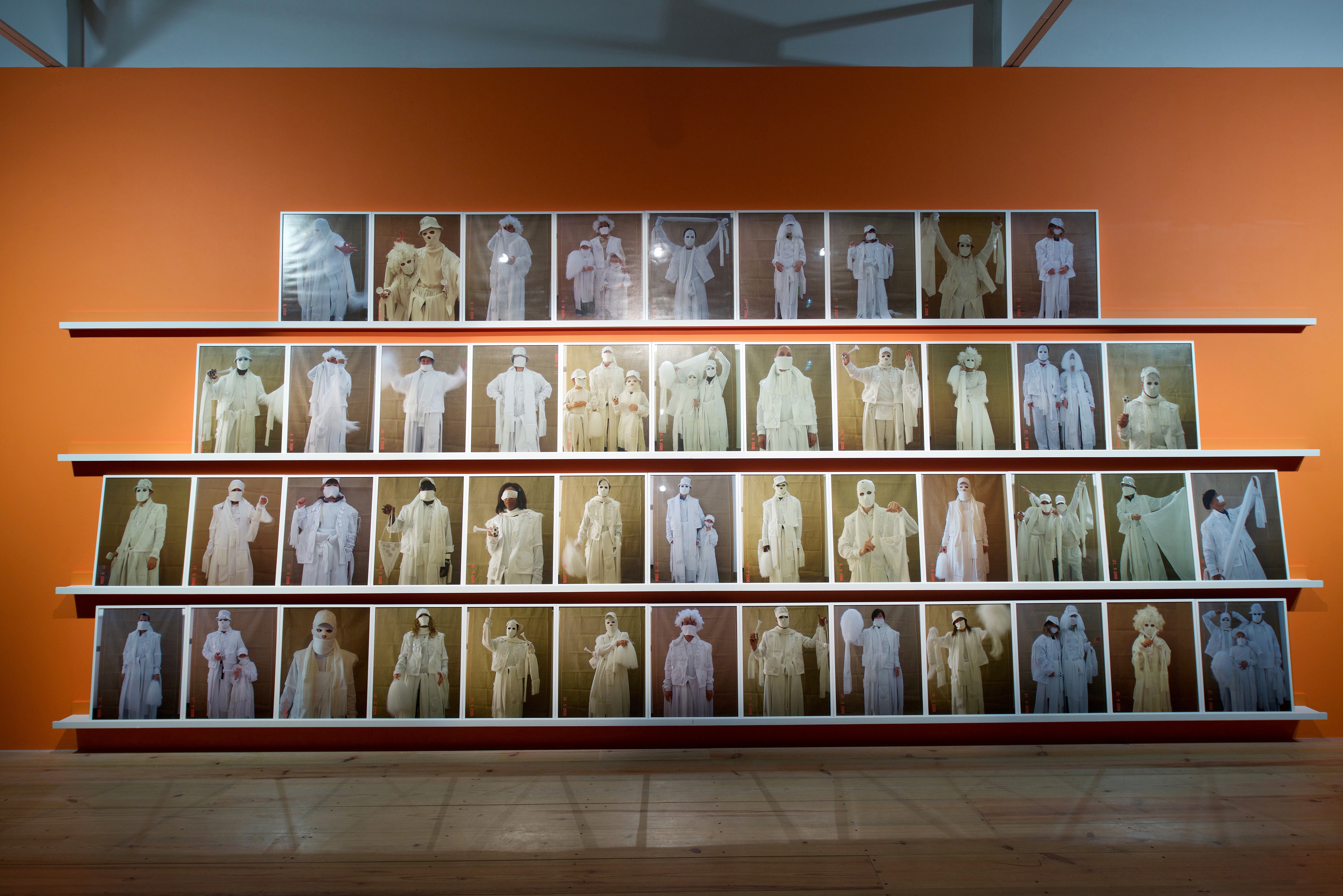 - Jean-Ulrick Désert – The passion, installation photographique. L’artiste réunit des photos de supporteurs de foot allemands en tenue traditionnelle, en même temps qu’il efface la couleur des uniformes. Une fois, les habits et accessoires blanchis, les différences sont gommées. On ne peut plus s’identifier. Les sujets portent d’ailleurs des masques qui rappellent l’habitude de certains supporteurs (Hooligans) de fréquenter les stades masqués. Désert convoque et dénonce en même temps le fanatisme sportif, national, le fanatisme tout court. Il résout en quelque sorte la violence par l’effacement. Au niveau de la scénographie le fond orange permet de récupérer visuellement la violence dénoncée de façon très conceptuelle.