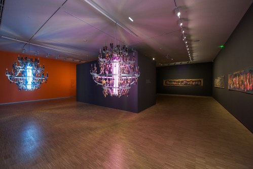 L’oxymoron m’enchante. (In)visibilité comme celle d’Haïti sur la scène de l’art contemporaine, dit le commissaire, qui avait déjà conçu la première et seule participation d’Haïti (2011) à la plus grande messe mondiale de l’art, la biennale de Venise. Ostentatoire comme la mise en lumière de l’espace par ces lustres magnifiquement étranges de Duval-Carrié. Ils me font penser au chatoiement argenté de sa Promenade du grand Baron, œuvre affiche de l’exposition Haïti Royaume de ce monde, dont Giscard était également commissaire en 2011.