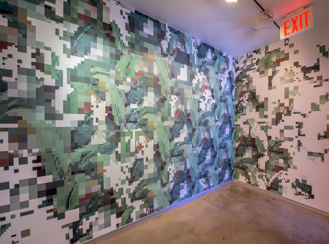 Cette installation s’inspire de deux papiers peints des années quarante, Brazilliance et Feuille de banane de la Martinique, conçus pour rénover la décoration de deux hôtels luxueux, l’Hôtel Greenbrier de Virginie Occidentale et l’Hôtel du Beverly Hills. Ce thème végétal tropical cherche à créer une sensation de fraîcheur, de tranquillité, de bien – être mais fait toutefois aussi référence au textile de camouflage contemporain employé par les forces militaires américaines présentes actuellement dans certaines régions de la Caraïbe. . Certaines parties sont pixellisées, brouillant et décomposant les modèles originaux, contestent la domestication de la nature. Des codes barres en filigrane redirigent le spectateur vers des sites qui évoquent la notion d’altérité, la « consommation » de la nature exotique
