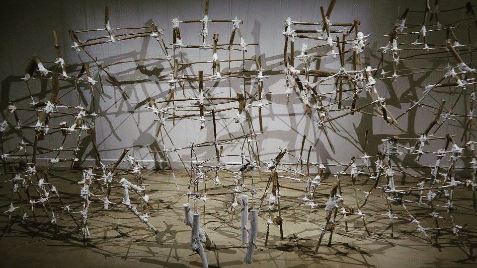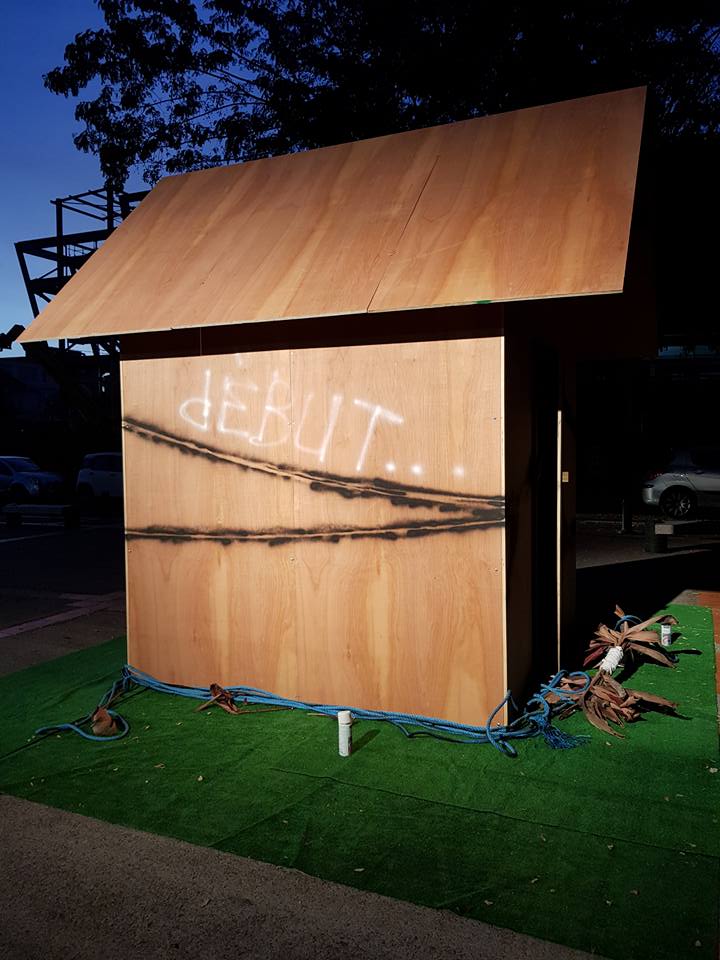 Les kaz (Trennelle-Citron-Grosse Roche) installation bois ti-baume, tissu, peinture acrylique, vidéo