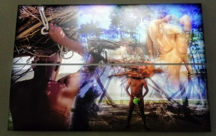 L’exposition d’Habdaphaï , Alive, en vie, en ce moment à la salle Arsenec au Tropiques Atrium, traite d’un thème que l’artiste explore en photomontages, dessins, peintures et installations land art depuis au moins trois ans : le territoire et son dédoublement, les migrants.[i] C’est une exposition très personnelle : l’artiste s’y met en scène nu sur une des photos et évoque le quartier de son enfance dans l’installation Trennelle-Citron-Grosse roche. Des nombreuses lectures qu’on peut faire de cette exposition, une au moins renvoie au parcours de l’artiste, à ses propres migrations et territoires, qui l’ont amené là où il est, toujours en vie.