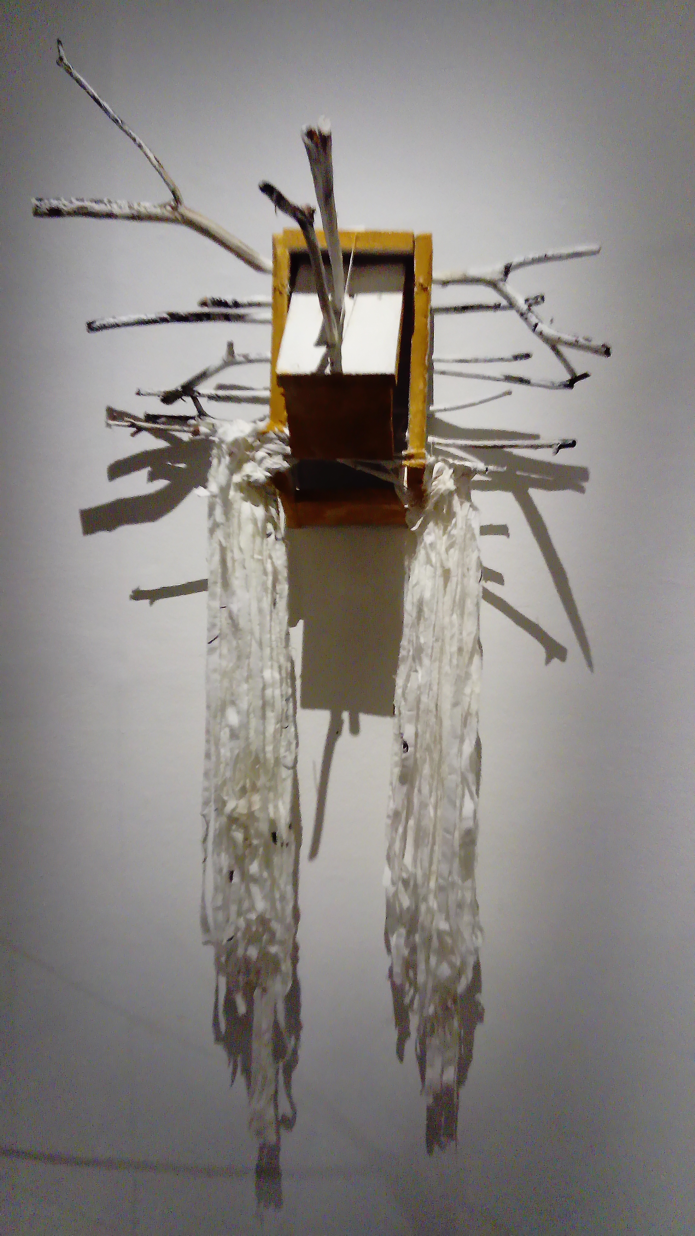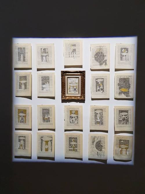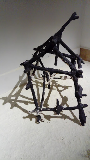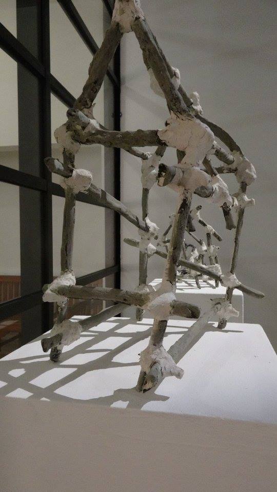 Artiste prolifique Habdaphaï produit tout le temps, par nécessité viscérale. La question du territoire, et donc de l’appartenance, lui a offert ici un terrain pour une expression plus intime, moins figée par les signes que certaines de ses séries. Les petites maisonnettes en céramique frêles et gracieuses, des objets très nouveaux dans sa production, me semblent participer de cette intimité-là. Elles me font penser au petit théâtre des sculptures en carton et bois, suspendues derrière des rideaux en dentelle de papier, qu’il avait créé pour sa sortie de résidence à l’ISBA de Besançon en 2014. Elles ont la même force poétique, la même finesse d’exécution, la même esthétique povera.