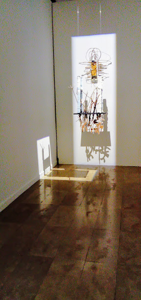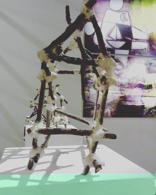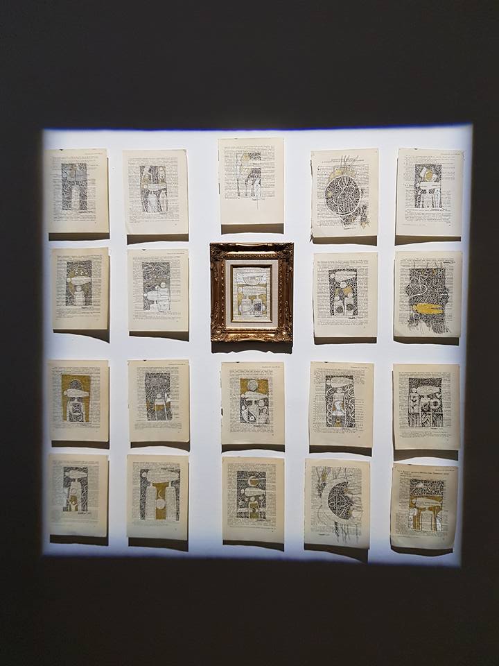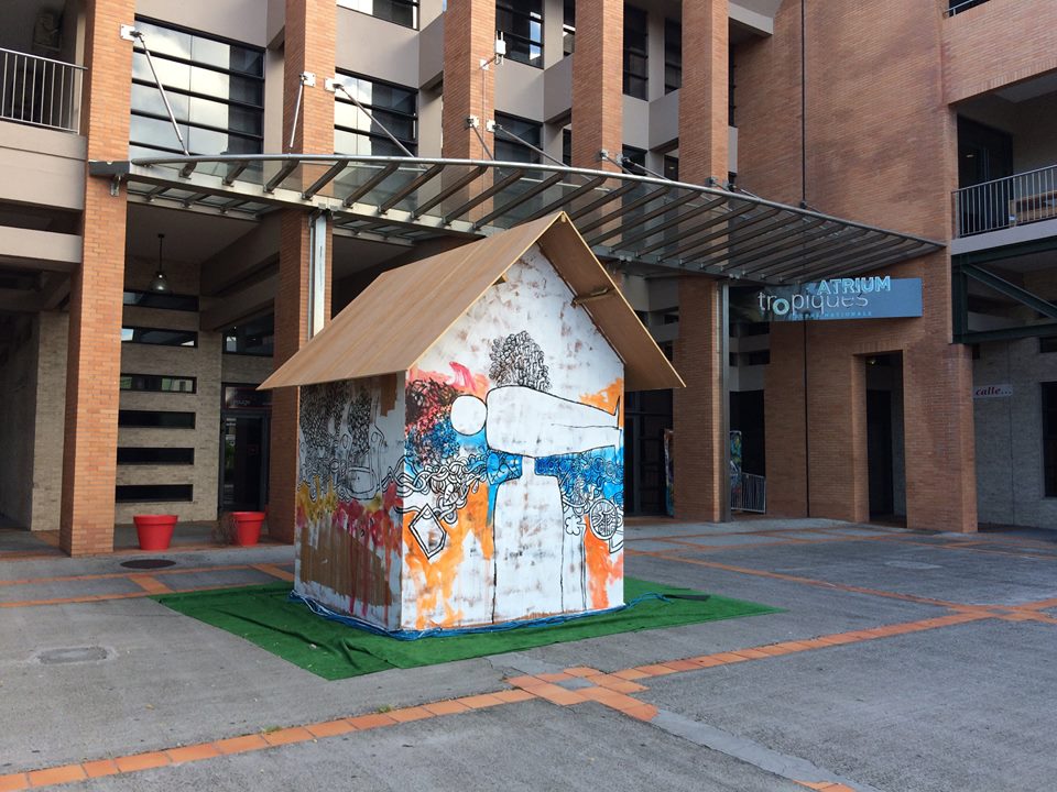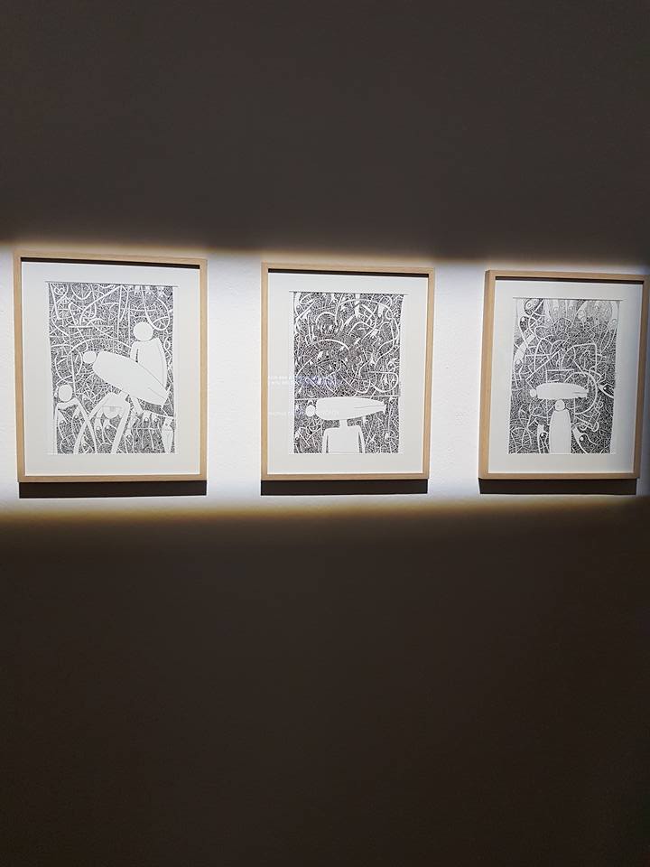 Car il a l’habitude de la scénographie, son accrochage est beau et sobre. Pourtant, il a choisi de « trop » montrer. Toutes les œuvres tournent autour des migrants et du territoire, mais il y a quand même 4 sous-ensembles bien distincts: les photomontages très colorés et chargés, les objets et installations nettement plus épurés, les dessins au tracé obsessionnel, et sur une table, un peu hors sujet et pas particulièrement mises en valeur, des très belles assiettes peintes. Sans compter la Kaz, sur le parvis de l’Atrium, support de performances devant se dérouler sur plusieurs jours et dont le lien avec l’exposition est moins évident. En parlant avec l’artiste on apprend que le lien entre la Kaz (la maison du bagnard) et l’exposition est plus programmatique que formel : la Kaz qu’il aménage petit à petit lors de performances quotidiennes, sera itinérante, afin d’accueillir d’autres performances, mais aussi des ateliers, peut être un point de vente, à disposition d’autres artistes également. Itinérance, entraide, l’artiste-saltimbanque se veut sur les routes, comme tous les migrants.