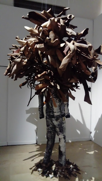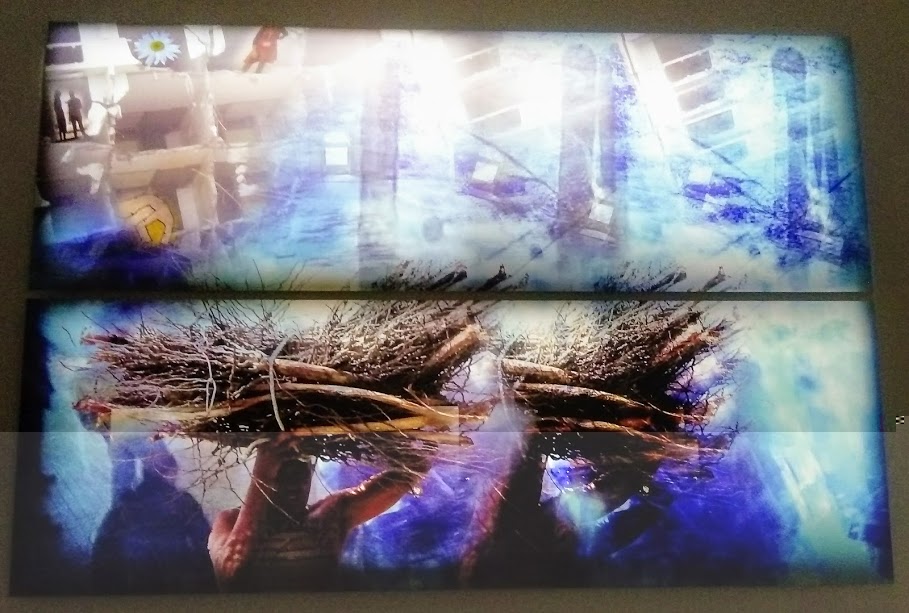 L’exposition s’ouvre sur des photomontages dans lesquels l’artiste porte des fagots sur la tête, comme un migrant porte ses maigres possessions, comme un ouvrier porte de la canne, de la banane ou du charbon…cela m’a fait penser aux migrants refoulés ou en attente d’un passage vers l’Europe. Une frontière (et partant, un territoire) est une idée abstraite que souvent, rien, en dehors d’une convention, ne matérialise. Habdaphaï s’intéresse à l’humain confronté aux limites territoriales. Toute frontière, même la plus surveillée, est poreuse…. L’échange est sa raison d’exister et paradoxalement ce qu’elle essaye de contenir. Les migrants d’Habdaphaï sont là pour tous les dépossédés de la terre, engagés dans l’éternelle négociation inclusion/exclusion, essayant de trouver leur part dans les festins auxquels ils ne sont pas conviés.