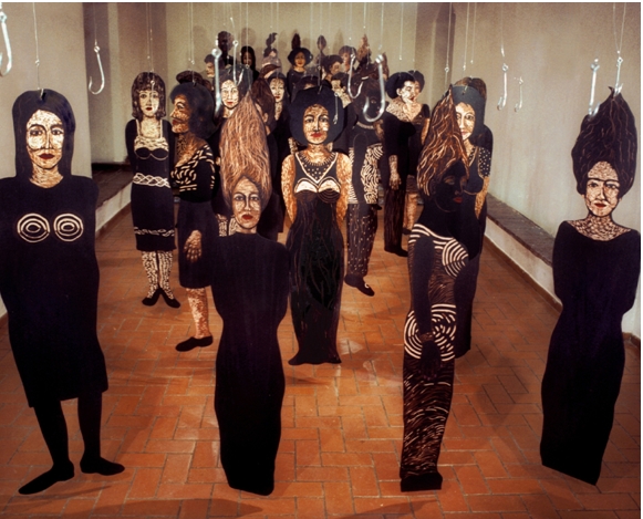 Nous quittons ici l’imaginaire projetant ses audaces. Ces femmes sont suspendues par leur chevelure comme des quartiers de viande. Ce thème de « l’auto exil » est récurent dans l’œuvre de Belkis Ramirez et m’a rappelé une autre installation, En offerta, de 1996 que j’ai découverte au Musée d’Art Moderne de Santo Domingo. L’installation se composait de 5 planches de bois de 2 mètres 50 de hauteur, adossées à un mur sur une longueur de 5 mètres. Chaque planche représentait un corps de femme – un portrait en pied – enveloppé dans une robe noire. Le visage et les mains étaient seulement visibles et semblaient sortir d’une sorte de camisole de force. Autour des panneaux de bois gravés par l’artiste, il y avait un éclairage avec des ampoules qui cernait le corps de ces femmes. Au niveau de leur ventre, à l’endroit du nombril, partait comme un immense cordon ombilical, un immense lasso qui formait sur le sol, à la fois une boucle, mais aussi un collet : un piège. Chaque lasso était de taille différente.