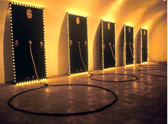 Avec cette installation, Belkis Ramirez a voulu donner un message précis sur la société dominicaine. Lors d’un voyage à Amsterdam, elle a pu constater qu’un très grand nombre de prostituées étaient originaires de son pays. C’est la métaphore de ce constat que l’artiste traduit dans son œuvre. La lumière des ampoules électriques faisait songer aux boutiques dans lesquelles s’affichent les prostituées du Quartier Rouge d’Amsterdam. Ces deux installations ont mis mal à l’aise les spectateurs, qui selon l’artiste, ne franchissaient pas l’espace tracé par les lassos.