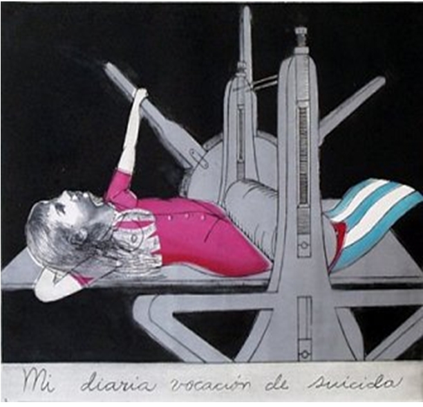 Le sentiment d’enfermement, de l’exil et l’attachement douloureux à Cuba, comme dans ce court extrait vidéo intitulé Naufrago de 2008, que je commenterai par la suite avec les sérigraphies et dessins de l’artiste.