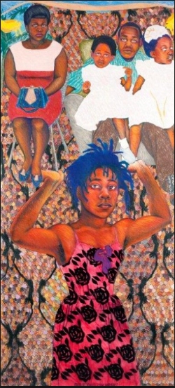Sonia Boyce recrée le cadre domestique de la maison antillaise avec Big Women’s Talk –conversation entre femmes- (1984) et … She’s holding on –Elle ne les soutient pas, elle s’accroche (quelle rose anglaise !) (1986). Les artistes britanniques noirs créent une sorte d’historiographie visuelle à partir d’un passé personnel ou collectif. Le rôle de la mémoire et la réinterprétation du passé permettent de resituer la mère, les Antilles et l’émigration.