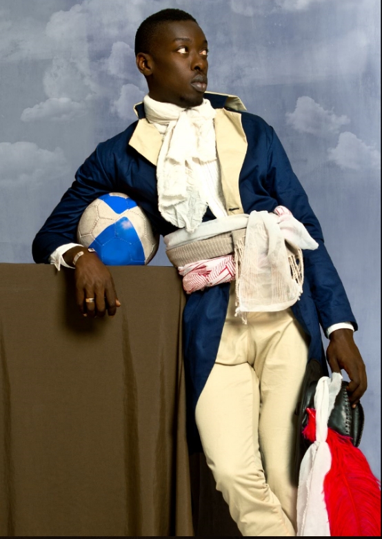Omar Victor Diop,  dans cette série Diaspora, incarne douze africains qui ont joué un rôle important hors de leur continent du  XVI au XIX ème siècle. Il revisite ainsi l’histoire du portrait de cour mais y introduit un détail anachronique emprunté au football, qui selon ses dires, révèle souvent où en est la société en matière de relations raciales.