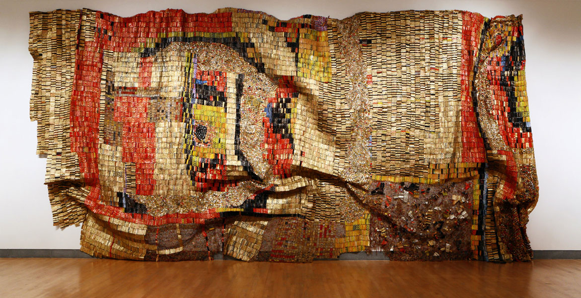 L’emploi de matériaux incongrus, caractéristique du paradigme contemporain trouve son illustration dans La silhouette effacée en capsules compressées de Freddy Tsimba mais sans atteindre la splendeur majestueuses des manteaux d’El Anatsui .