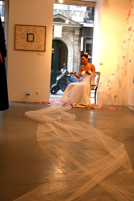 C’est le cas de Complexe de Cendrillon (2008). Pendant sept heures l’artiste habillée d’une robe blanche, sera assise dans la vitrine de la galerie JM arts à Paris, en train de broder un voile blanc avec des pétales de rose artificielles. Posée là comme « un objet exotique », une femme de couleur en robe de mariée, l’artiste investit l’éducation féminine haïtienne, celle qu’elle a reçue de sa mère et qui construit la féminité à l’intérieur des familles par des enseignements divers dont des travaux d’aiguille, en passant de mère en fille les valeurs de patience et passivité.