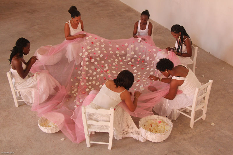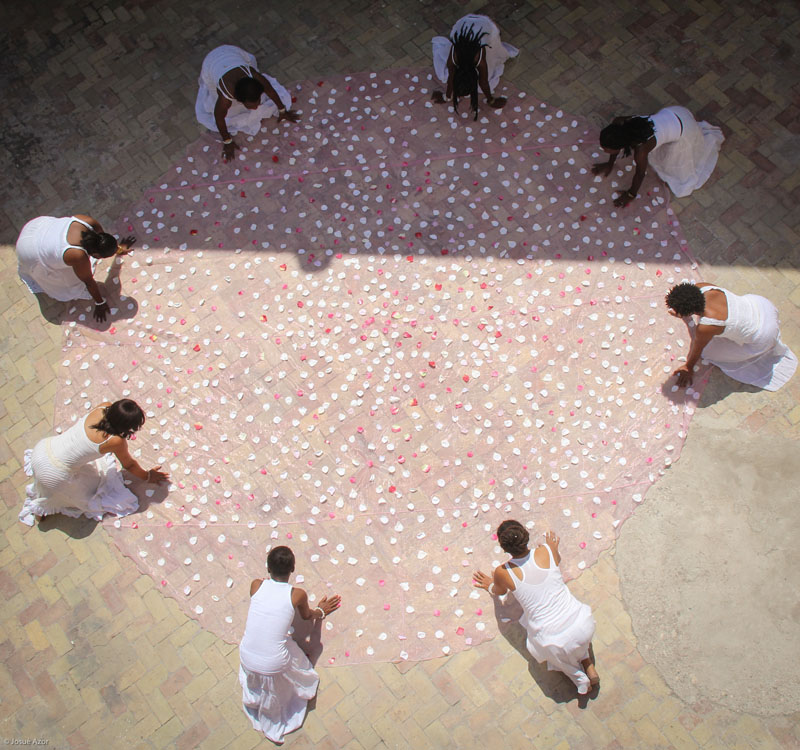 Dans la  performance Le cercle de Freda(2015), l’artiste et 5  ou  6 autres femmes brodent pendant 7 heures un voile de  8,5 de diamètres, en y insérant des pétales de rose artificielles tout en chantant le loa d’Erzulie Freda, entité de l’amour et de la féminité. Coquette et très friande de beauté et de parures, Erzulie Freda incarne également la compassion. En entonnant son loa dans cette performance ritualistique, l’artiste propose de reconstituer le tissu social en activant un savoir « subalterne » : la broderie. J’aime sa façon de prendre la place subalterne assignée aux femmes et depuis ce lieu là exactement permettre à la société de guérir symboliquement de ses blessures.