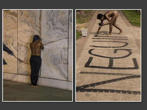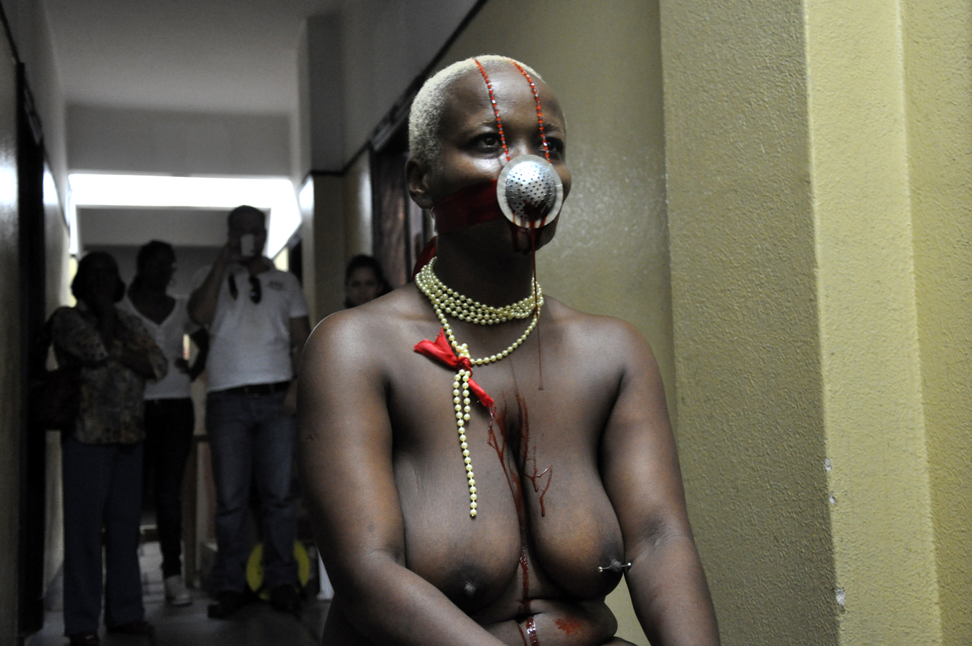Ces performances de Michele Matiuzzi  renvoient à la représentation idéalisé ou critique des corps noirs dans l’histoire de l’art brésilien, depuis les aquarelles de Debret (1821) aux mulâtresses sensuelles de Di Cavalcanti en passant par l’iconique négresse de Tarsila do Amaral. En portant un ersatz du masque de flandres, punition des esclaves qui parlaient trop ou qui étaient soupçonnés de vouloir se suicider en ingérant du poison, l’artiste évoque également  le silence auquel la femme est réduite. En convoquant toute cette imagerie l’artiste questionne et brouille la place à laquelle est assignée la femme noire.