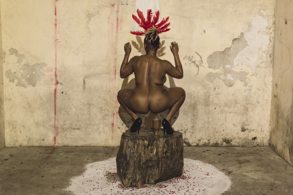Dans Genesis  (2015), l’artiste, torse nu, attachée par les poignées au mur, est fouettée par un autre artiste, au son de cloches d’une église.  Dans Purificação 1(2013), l’artiste écrit par terre des insultes dont son corps presque nu est recouvert. Pendant qu’elle écrit elle laisse sur les mots par terre les marques de ses pas. A la fin l’artiste  se lave en effaçant les mots de son corps. Dans Deformação (2015) face à la glace elle essaie de modifier son apparence avec du maquillage en s’éclairssisant la peau et en se lissant les cheveux. Dans Reéducação (2016), assise à une table, elle déchire des pages de la bible sur lesquelles elle écrit un mythe de la création du monde yoruba. Un acte qui confronte l’éducation chrétienne reçue dans sa famille. Et qui rappelle à l’agressivité avec laquelle les nouvelles religions chrétiennes tentent de marginaliser les religions afro-brésiliennes.  Dans Vem …..pra ser infeliz  (viens…pour être malheureux) de 2017,   Priscila nue danse la samba juchée sur des hauts talons  jusqu’à l’épuisement  en portant une coiffe en plumes, mais aussi un masque de flandres, tandis que son torse est recouvert de collages du mot mulata (mulâtresse),mais aussi d’autres mots associés à la sur-exposition du corps noir, son hyper-sexualisation comme on peut voir/entendre dans les programmes de TV brésiliens. Le titre évoque la chanson-thème (Vem vem vem …pra ser feliz – viens , viens, viens ..pour être heureux) du concours de « passistas » organisé par la chaine de TV Globo chaque année, dans le cadre du Carnaval. L’artiste porte ici un regard critique sur la mulata, identité-exportation des femmes noires au Brésil.