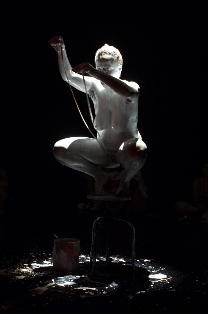 La performance Merci beaucoup Blanco! est au départ très simple : l’artiste peint son corps noir en blanc tout prenant des poses dans l’espace sombre, soulignée par la lumière dirigée sur son corps. C’est comme une suite de photographies qui titillent les stéréotypes de la féminité noire. Des « provocations artistiques », questionnements d’amis artistes, l’ont amené à ajouter des perles qu’elle extrait de divers orifices de son corps, ou à manipuler et lire un petit billet qui demande : « veux-tu être jolie ? », ce qui résonne forcément avec l’action et avec ses postures douces et souriantes, plutôt séductrices.