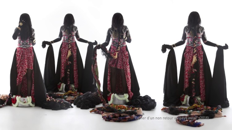 Sur la question du rapport à l’Histoire, Kelly Sinnapah Mary (Guadeloupe, 1981), fait un très beau travail de mémoire, vis-à-vis d’une population qui n’a pas subi l’esclavage mais dont l’histoire, la présence, la contribution à l’identité commune et sa propre identité sont largement « invisibilisées » dans les Antilles françaises :  les indiens. Sa série Cahier d’un non-retour au pays natal, reprend et modifie le titre de Césaire, pour traiter de cette histoire douloureuse qui la concerne aussi personnellement. Les migrants indiens engagés par les plantations après l’abolition de l’esclavage avec la promesse d’un retour en Inde, se sont trouvés asservis, dans l’impossibilité de rentrer chez eux et méprisés par le restant de la population.  Kelly dont les deux grands-pères étaient des prêtres hindous et dont le père avait joué du tapou , a grandi coupée de toute tradition (religieuse ou autre) indienne car ses deux parents ont embrassé une religion chrétienne.  Depuis, l’artiste fait le chemin inverse de ses parents, en se rapprochant d’une identité, une mémoire, une esthétique aussi. Cette série traduit plastiquement  par l’élément tressage des cheveux l’impasse du non-retour et la reconstruction d’une identité mise à mal par l’intégration.
