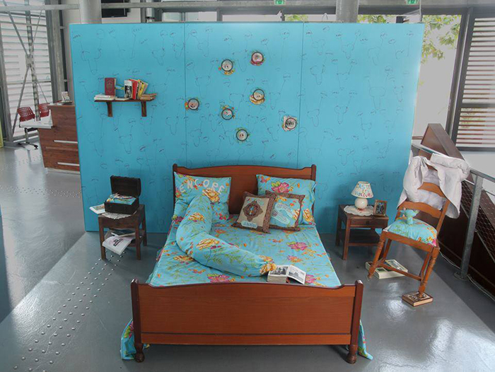 Personnellement concernée par le statut des femmes dans la société et par les rapports de domination, spécialement ceux que subissent les femmes, Kelly a créé  Vagina, installation in progress, dans laquelle l’artiste recrée un univers féminin, quasiment doucereux dans ses motifs floraux aux tons de bleu, doré et rose. Au Perez Museum, elle reconstitue une chambre d’enfant-jeune-fille où tout semble  immobile et calme mais où la violence couve, sous la forme de sexes masculins dessinés ou brodés sur les fleurs, les cousins, dont certains sont des vagins percés d’épingles.  Ces œuvres déroutent par le contraste entre l’ambiance feutrée et la violence subtilement omniprésente. Un fait divers a donné lieu à Vagina, Jyoti Singh Pandey, du nom de la jeune indienne violentée dans un bus a New Delhi. Kelly grâce à quelques artefacts (une cagoule avec une grosse bouche, une perruque, des habits indiens)  devient dans ses photo-performances un personnage féminin qui n’est plus seulement une victime, mais elle-même prédatrice. Habillée à l’indienne, avec une énorme bouche qui tient autant du fantasme masculin, que de sa persona prédatrice, mais aussi d’une sorte de désespoir (cette bouche comme dit l’artiste est une béance) elle tient dans ses mains, comme une offrande, une paire de ciseaux.