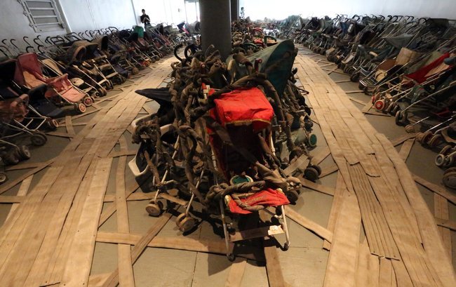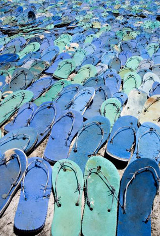 Les installations peuvent être constituées soit d’objets de rebut soit de produits manufacturés. Tony Capellan (République Dominicaine, 1955) et Nari Ward (Jamaïque, 1963) choisissent des objets usés, rejetés voire des ordures pour composer leurs oeuvres. Pour son installation in situ la plus célèbre, Mar Caribe, exposée plus de dix fois entre 1996 et 2017 dans des institutions internationales, Tony Capellan collecte sur les berges dominicaines les tongs usées soustraites à leurs propriétaires des quartiers populaires par des inondations. Ce sont près de cent cinquante vieilles poussettes abandonnées que Nari Ward a collecté dans des quartiers populaires de New – York pour Amazing Grace. Ward a agencé un cheminement au sein des poussettes où déambule le public au son d’une interprétation du cantique « Amazing Grace » par la chanteuse de gospel Mahalia Jackson. Tous deux subvertissent également la fonction originale des objets. De plus, ces installations sont fondées sur la répétition –juxtaposition d’un même objet, tout comme Sanfika de Pinas, ce qui leur confère une forte présence. A l’opposé, les installations de Tirzo Martha (Curaçao 1965) sont fondamentalement hétéroclites. On pourrait croire un chantier abandonné ou le bagage arrimé en urgence de migrants sur le départ. Lorsqu’elles sont plus structurées, elles évoquent un autel.