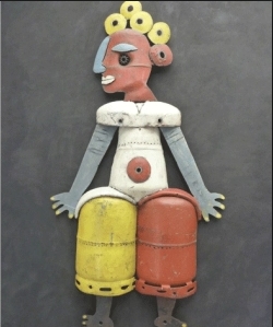 On pense aux Expressions – clés d’Hamid de 1992 où l’artiste inscrit dans un même espace pictural, une toile creusée d’une alvéole, un jouet, singe ou cavalier playmobil et sa représentation graphique. On pense encore à l’assemblage ludique de Thierry Jarrin, Bigoudia (2010) qui transforme une bonbonne de gaz coupée en deux en une femme de profil en bigoudis ou à la série Hélico de Laurent Valère