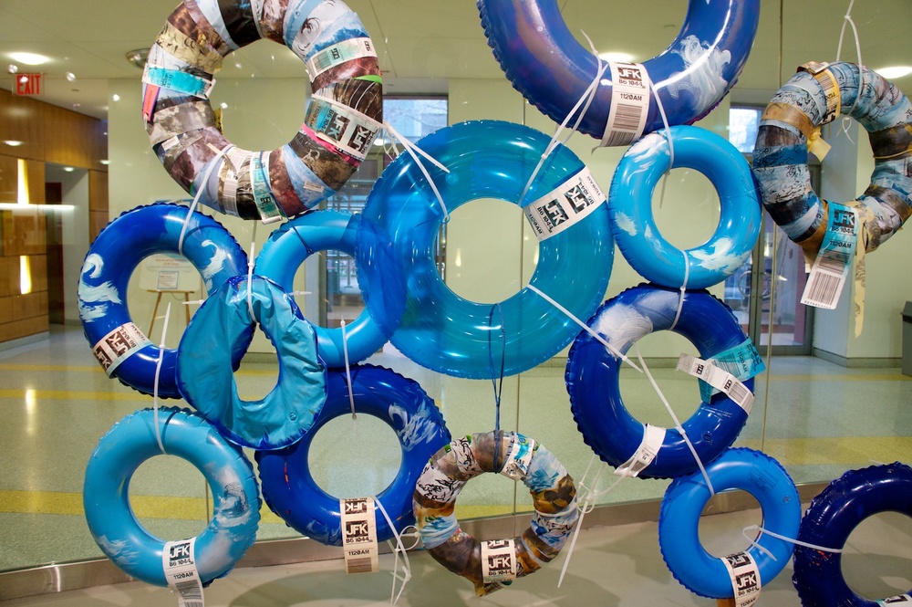 Marcel Pinas (Surinam, 1971) et Scherazade Garcia (République dominicaine 1966) optent pour des produits neufs. Pieken Kukuu de Marcel Pinas questionne la confrontation de la tradition culturelle et du flux contemporain en reproduisant la disposition des intérieurs surinamiens ou en gravant des graphismes ancestraux sur les couverts d’aujourd’hui. Si l’on retrouve des ustensiles de cuisine dans les installations de Marcel Pinas, la bouée de sauvetage semble être un leitmotive de Scherazade Garcia qui développe des récits allégoriques sur la migration, le métissage, les conséquences de la colonisation.