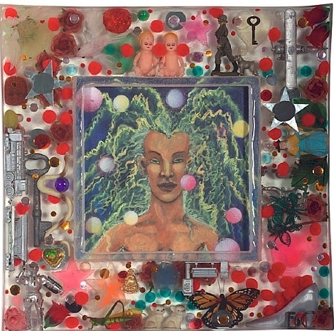 Au premier abord, elles apparaissent colorées, fantaisistes et suaves. Ce sont des assemblages d’images historiques et de divers petits objets prisonniers de la résine transparente, indissociables de leur cadre artistiquement travaillé, illustrations de l’histoire violente et cruelle de la Caraïbe. Une source lumineuse les fait littéralement rayonner.
