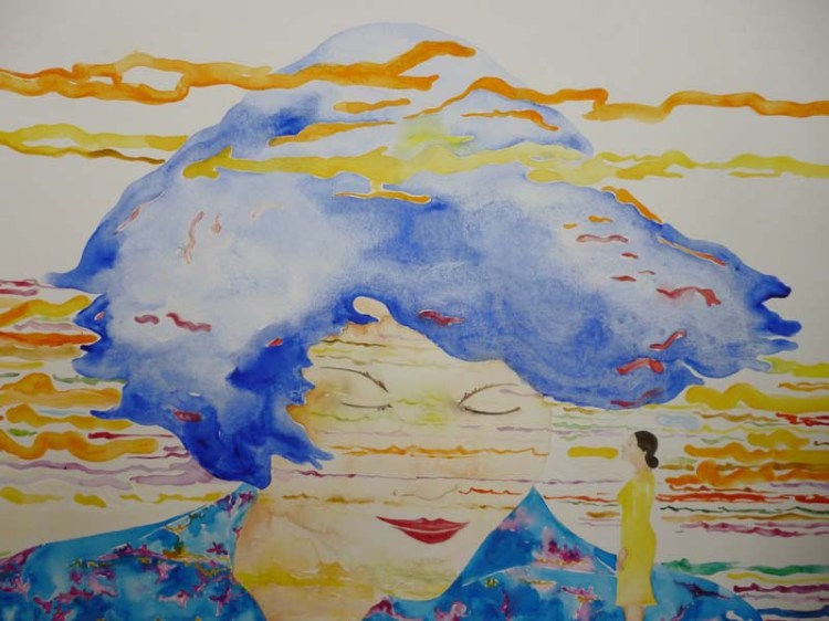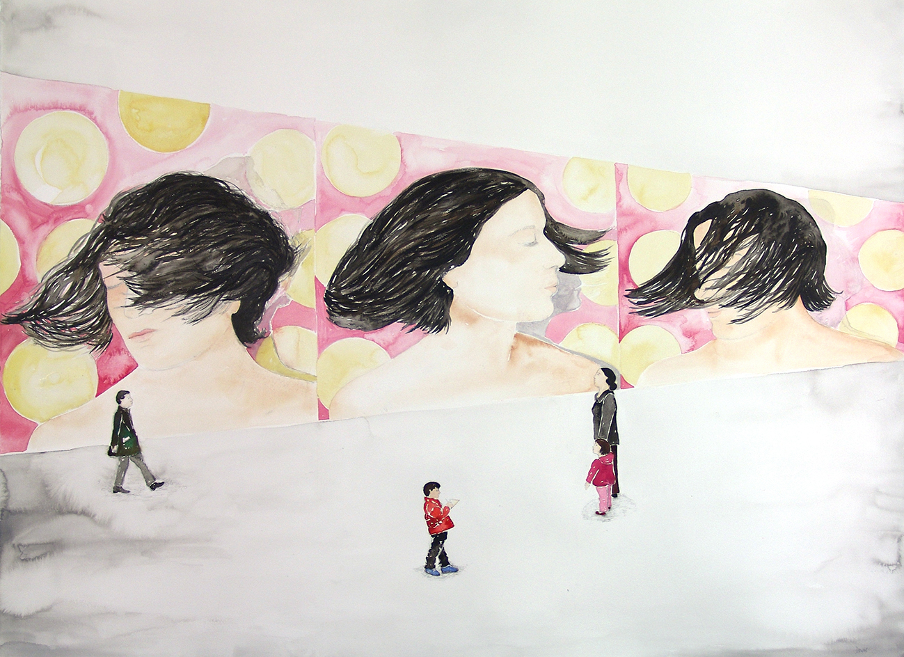 Oriana contemplando el video Pájaros en la cabeza de Mónica Dower, aquarelle sur papier, 97 x 120 cm, 2010