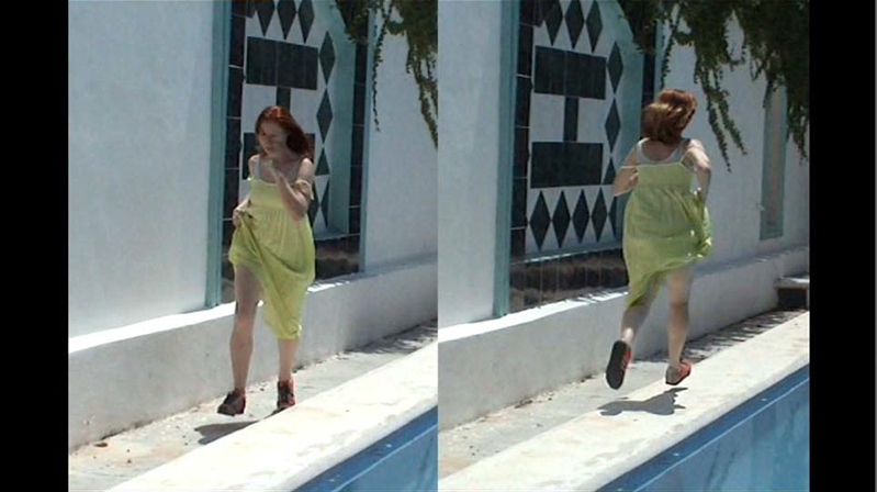 Dans la vidéo Vital, que j´ai réalisé spécifiquement pour être traduite en peinture, une danseuse court de façon obsessive et absurde autour d´une piscine. Mon idée et d´enregistrer les différentes sensations qu´ elle expérimente, tout en insistant sur les nuances de couleurs, de formes et de lumière.