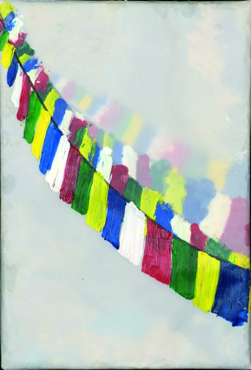 Alejandro Campins recouvre sa toile de papier transparent à la recherche d’une forme de profondeur pour ses Banderas de benedicion entre drapeaux de prière tibétains et lignes de linges à sécher entre deux immeubles.