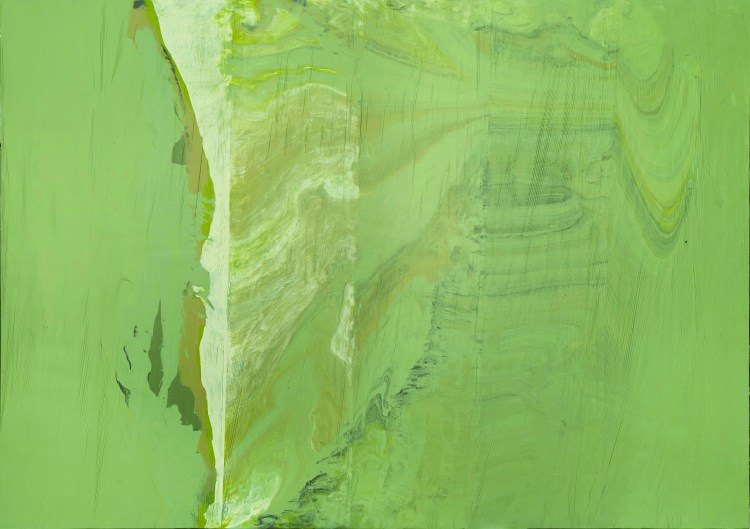 Dans cette exposition, même les œuvres en apparence les plus traditionnelles, toiles et pigments, inventent une nouvelle picturalité. De nouveaux gestes créent un rendu inattendu. Ainsi José Yaque applique ses pigments à la main puis enveloppe ses peintures de film plastique à usage culinaire qu’il enlève lorsque la matière commence à sécher. La surface peinte semble comme érodée.