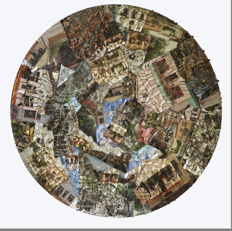 Les œuvres de Mabel Poblet, nouvelles interprétations du genre du paysage, sont composées de feuilles d’acétate, de fragments de photographies morcelées, brisées, découpées, explosées puis reconstituées en relief et superposées sur un fond rond contestant ainsi à la fois la planéité du tableau et son format traditionnellement rectangulaire ou carré.