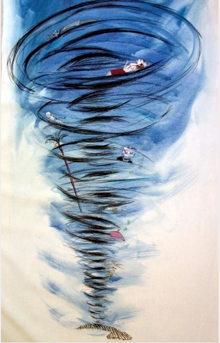 Dès lors comment s’étonner du désir permanent d’échapper à l’île? Ce rêve de fuite est maintes fois exprimé dans les peintures, les gravures, les vidéos de Sandra Ramos qui imagine les moyens les plus fous de quitter les rivages cubains, à l’image de la gravure Escape où Sandra- Alice s’imagine aspirée par un vortex.