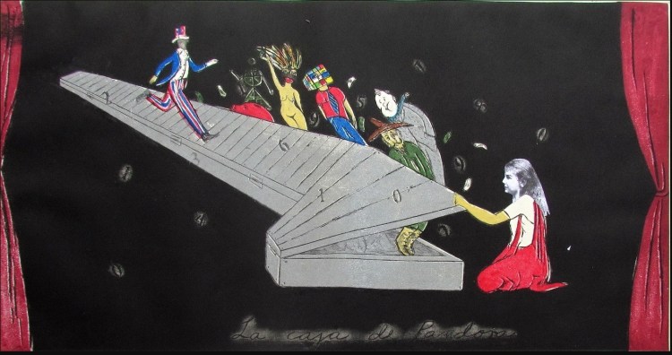 La forme allongée de l’île de Cuba devient un cercueil d’où s’échappent bien des maux dans la Caja de Pandora de Sandra Ramos. Une petite fille en uniforme scolaire cubain, Alice le double de Sandra, entrouvre cette boîte alors qu’Oncle Sam, caricature de l’américain, arpente martialement le couvercle, l’empêchant de s’ouvrir complètement. Cependant s’en échappent Liborio, le paysan cubain, Bobo le fou. Ce sont de célèbres caricatures cubaines très populaires. Viennent ensuite le symbole de la bureaucratie cubaine, étrange petit bonhomme à la tête de rubicube, ce casse tête des années soixante – dix, puis une jinetera, la prostituée.