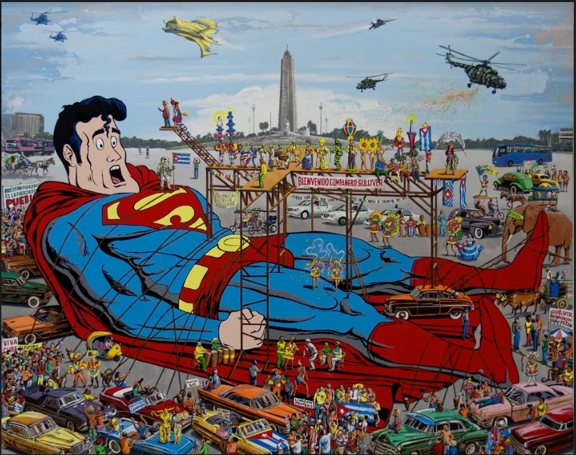 Diago, Fonseca, Barroso, Esquivel comme Toirac, Francisco, Tamayo, Ramos portent un regard critique sur la réalité cubaine. Tamayo, Francisco et Ramos évoquent les relations de Cuba avec les Etats – Unis. Si Tamayo semble, sur le mode humoristique et avec une esthétique de bande dessinée, émettre le souhait d’un renversement de la suprématie américaine, Francisco, dans Fabrica de Utopia, semble assimiler les processus politiques en peignant une fabrique de drapeaux où se confondent les bandes bleues et blanches, blanches et rouges, les étoiles des drapeaux cubains et américains.