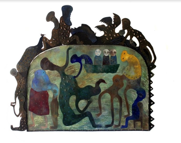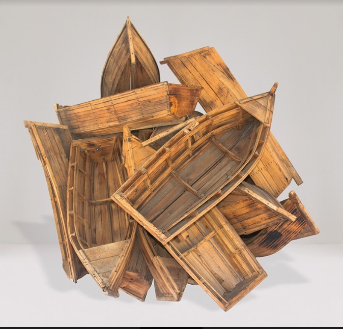 Il y a donc l’obsession de l’exil, de la migration, l’obsession de la mer chez Ramos comme chez Kcho. Cet artiste cubain internationalement reconnu depuis 1994 compose son œuvre exclusivement d’images ou d’objets qui évoquent la mer : barques, rames, vieux pneus transformés en bouées. A l’entrée de l’exposition, une installation – accumulation de barques, très représentative de ses créations, impose sa puissance. Avec Milagro, Kcho élargit la thématique de la migration aux mouvements migratoires du reste du monde, en hommage à tous les balseros prêts à braver tous les dangers pour un monde meilleur. Cette peinture-dessin semble être l’esquisse préparatoire d’une œuvre emblématique, Milagro. Donnée par le président de Cuba, Raúl Castro Ruz, au Pape François lors de sa visite à Cuba en 2016, cette œuvre a été installée à Lampeduza. Milagro associe un grand Christ sur une croix des rames. Le Christ est sculpté de manière traditionnelle et réalisé par les artistes du Musée Romerillo Organic (MOR) de Trinidad à Cuba et le Kcho Estudio, avec les techniques anciennes; la croix est un assemblage de rames usées.