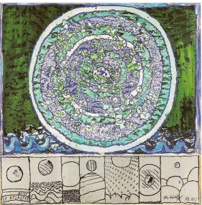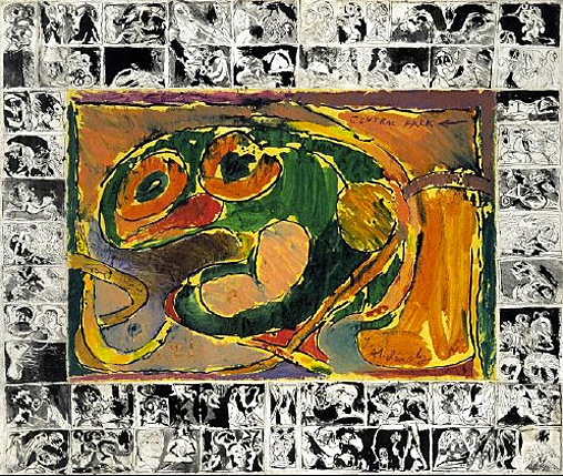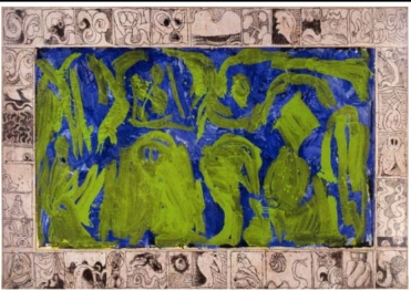 Voilà le principe des remarques marginales d’Alechinsky : une image centrale est encadrée par une série de vignettes réparties sur les quatre côtés de cette image. Inspirées par la bande dessinée et les arts de la gravure, ces vignettes complètent ou commentent la représentation centrale à la manière d’une écriture. Il se crée des rapports entre les deux strates picturales .