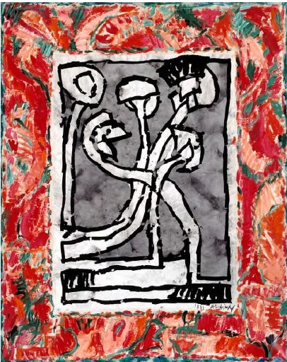 Il existe un équilibre subtil entre la spontanéité du geste pictural développé dans la partie intérieure et les dessins marginaux. L’image principale est de taille nettement plus importante et les rapports qu’elle entretient avec celles des marges varient.