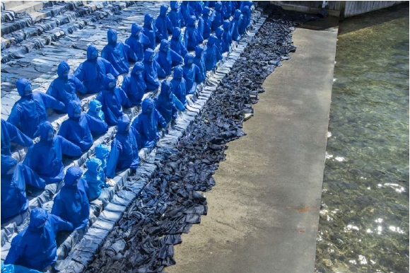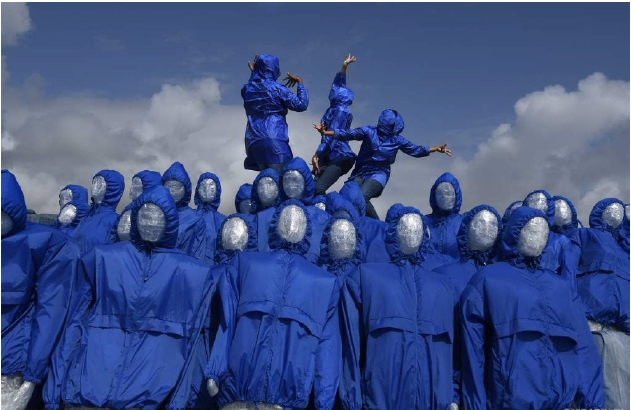 Après les ouragans Maria et Irma, la migration forcée et la vulnérabilité qu’elle entraîne augmentent. C’est ce que traduit l’installation monumentale en jeans recyclés de Guy Gabon, Les réfugiés du changement climatique, en écho avec la déambulation chorégraphique Yué, engendrée lors des mouvements sociaux de Guyane en 2017.