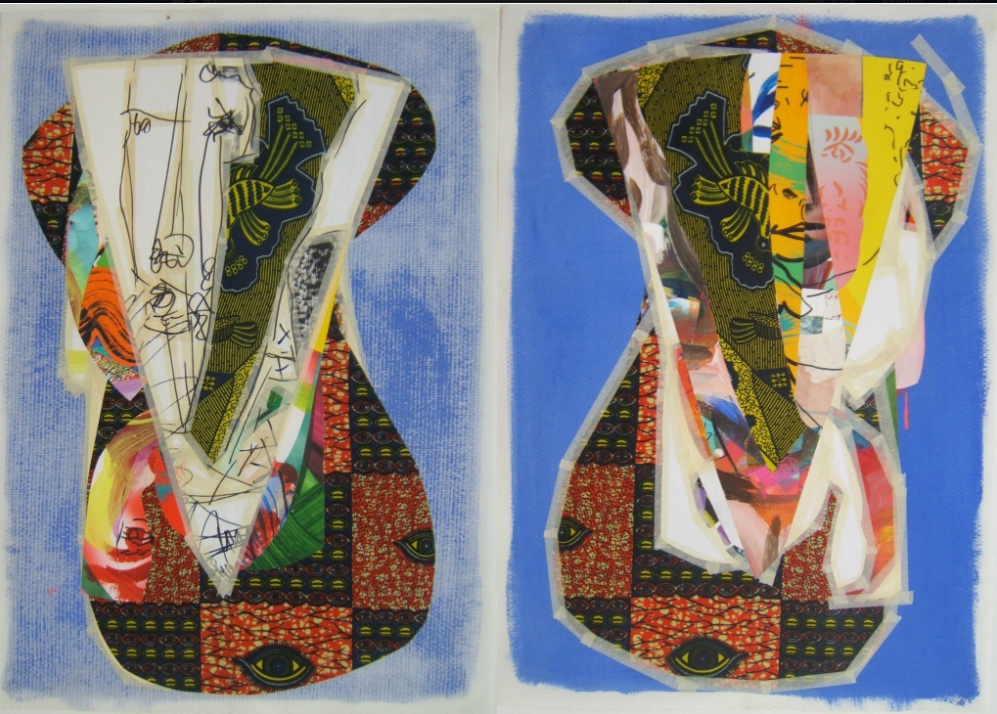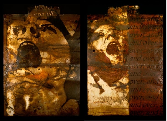 Vous l’avez sans aucun doute remarqué, certaines œuvres exposées dans la Nef ou la Cuverie sont des oeuvres bilatérales : Les Déracinés de Thierry Cauwet, Palimpseste- Mes- Tissages de Valérie John et Hobo I et II de Wolfric. Deux d’entre elles sont travaillées différemment de chaque côté. Les signes des deux Hobo de Wolfric n’apparaissent sur le verso que par transparence.