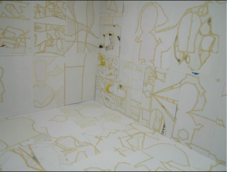 D’autre part lorsque Thierry Cauwet réalise des vidéos ou des tableaux vivants, il aime à retourner ses feuilles et les disposer sur les murs côté verso pour créer une sorte d’espace intime.