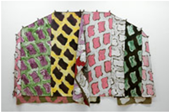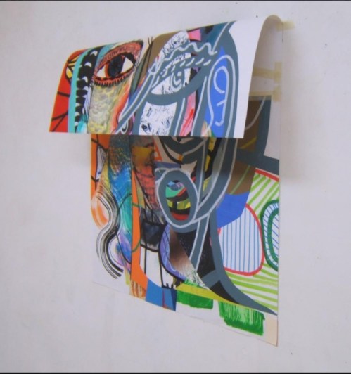 « Ces papiers superposés se font palimpsestes, partiellement recouverts ou couverts, tressés les uns aux autres. L’œuvre se lit dans son épaisseur. Il s’agit d’élaborer une peinture, de réaliser des superpositions où les structures se perdent. Puisque recouvertes, s’architecture des chevauchements…des croisements des tressages, qui masquent, dévoilent et à nouveau cachent. Seule l’œuvre décide. Le début pouvant devenir devant ou dos. Elle impose sa lecture « tournante ». Cela provoque cette idée du recto verso. L’œuvre est autonome : elle impose son système de présentation. Le regard doit impérativement circuler – au-dessus – au-dessous – devant – derrière. Elles sont comme un corps hybride, elles dépassent la mesure. Tous les morceaux ne font plus qu’un corps, pour supporter la verticalité. »