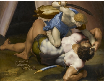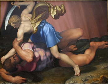 Au XVI siècle, Daniele da Volterra réalisa vers 1550-1555 pour Giovanni della Casa, un modèle en terre cuite et cette peinture a deux faces représentant toutes les deux le combat de David & Goliath. La peinture représente la même scène vue de dos et vue de face. Les deux scènes sont en léger décalage. .Le tableau est peint d’après un dessin de Michel-Ange, maître, ami et protecteur de Volterra. Sa réalisation s’inscrit dans un débat artistique, qui opposait les mérites respectifs de la peinture et de la sculpture : Bien qu’en deux dimensions, le fait d’être à double face permet au tableau de rivaliser avec une sculpture. Volterra réalise une maquette en argile pour préparer le tableau. L’oeuvre a rapidement du succès, mais le nom de son auteur tombe dans l’oubli. Elle est actuellement exposée au Musée Du Louvre, où elle a été restaurée après avoir été aspergée de pluie, suite a la rupture d’une baie vitrée du Chateau de Fontainebleau où elle était conservée. Elle fut offerte à Louis XIV, en 1715 par Nicolo del Giudice, avec un nouveau piédestal en bois doré permettant de faire tourner la peinture.