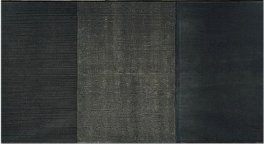 Jean Degottex, lié à l’abstraction et au minimalisme dans la série Jean Degottex Lignes-Report I. 1977, exploite lui aussi le verso des œuvres. Il renonce au pinceau pour des outils plus incisifs tels que le cutter ou le tournevis. Il utilise aussi le balai et la brique pour frotter la toile de lin à l’envers, utilisant ainsi le verso d’une toile longtemps réduite à son seul recto. Dans la série des lignes-report, par un système de pliage et d’encollage complexe, les répartitions de la peinture noire et de la colle de peau varient, produisant différentes valeurs de noir et divers effets de matières. Matité, opacité, brillance, le noir n’y est jamais uniforme. Les toiles sont striées de lignes horizontales tracées à l’aide d’un tournevis plat qui vient griffer la matière. Ces lignes découvrent le lin dont elles révèlent la trame. Parce que Degottex travaille sur des toiles préalablement pliées, les lignes se reportent automatiquement d’un volet à l’autre de la toile. Profondément gravées sur un pan de toile, elles rejaillissent en surface sur d’autres pans, donnant à voir une diversité de textures. Derrière l’apparente simplicité des lignes horizontales, un jeu subtil de report de matières et d’empreintes par estampage anime toute la surface du tableau.