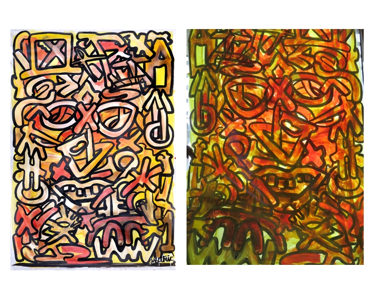 Il arrive que le verso de certaines œuvres apparaisse à l’artiste plus beau (que le recto). Il les recoupe alors mais en n’attribuant aucune suprématie du recto sur le verso. Des peintures aussi réussies des deux cotés après découpe peuvent être présentées entre deux plaques de verre comme ces deux oeuvres de la série Tout Monde.