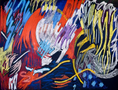 Je pratique à la fois la peinture, l’installation, le volume, un certain dessin contemporain. J’ai toujours travaillé en même temps je créais. La création au cœur de ma vie. Que vous pour ne pas proposer un résumé de CV trop âpre ? Depuis quelques années je travaille globalement, uniquement avec le pastel à l’huile, un matériau très coloré, très charnel et très exigeant et en même temps, j’essaie de maintenir d’autres pratiques. En solitaire je travaille la peinture, en équipe, je travaille l’installation.