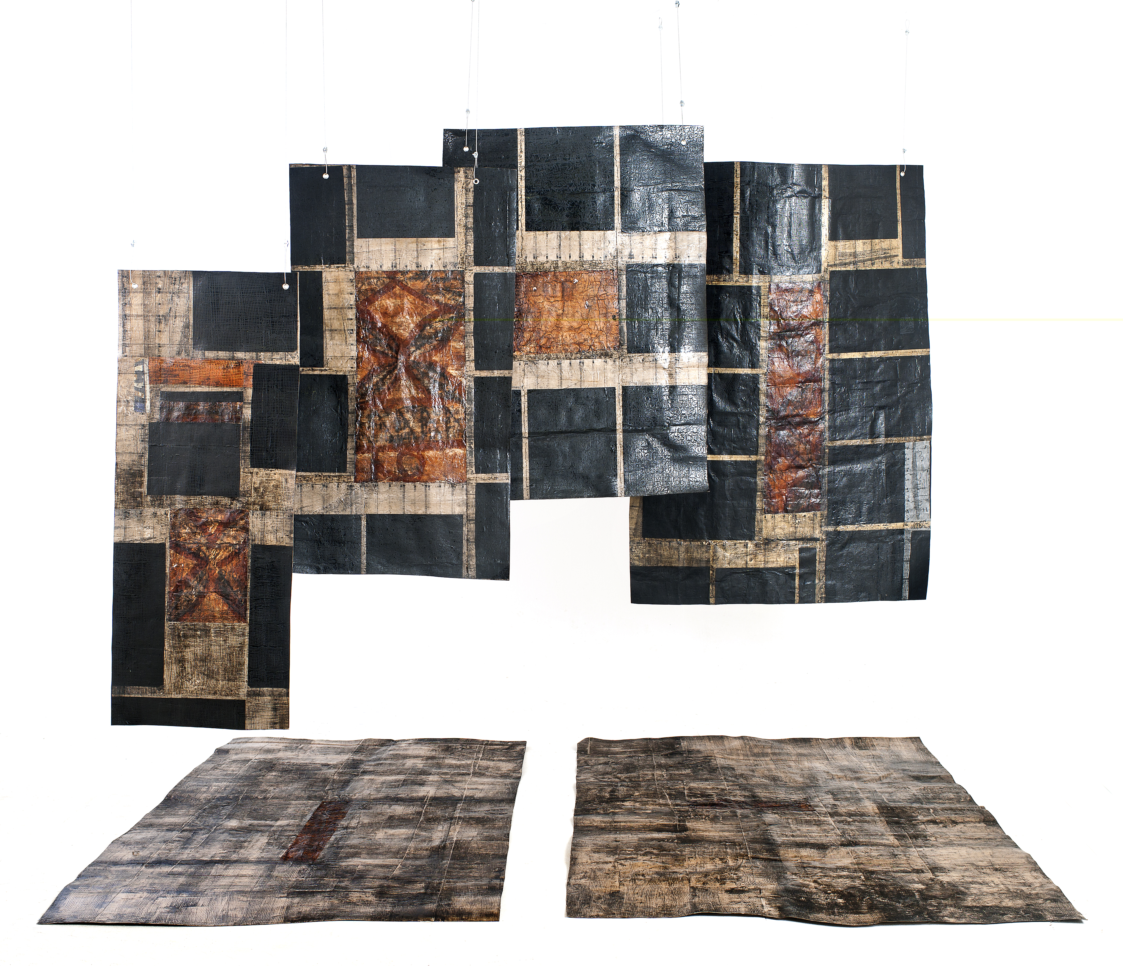 Et c’est véritablement à ce moment là, que je crée une rupture et que je vais m’attacher à essayer de trouver au travers d’un objet, le pagne bogolan, que je vais déconstruire et qui va être, je dirais, le prétexte à la construction d’une espèce de territoire pour le créateur que je suis, je vais donc l’analyser, le déconstruire, ça va me permettre aussi d’être à distance de mon lieu, qui est la Martinique et, pendant que je suis dans cette distance par rapport à mon lieu, par rapport à une certaine histoire aussi de l’art, je vais donc désapprendre, pour construire cette pratique et mettre à l’œuvre. Donc ce pagne, je vais l’analyser, il est fait de morceaux, il est fait de recto, de verso, il a une mythologie, il a une histoire dont je vais véritablement m’approprier, mais toute cette période que je vais faire en Terre Africaine, dans cette partie de l’Afrique de l’Ouest, donc du Sénégal au Mali, en Gambie jusqu’à une certaine partie de la Guinée, où véritablement je vais pendant toute cette période, réapprendre et réapprendre la peinture, réapprendre des pratiques , un geste d’une certaine simplicité, c’est-à-dire que je vais essayer de me détacher de tout ce qui fait les Beaux-Arts, le châssis, la toile tendue, la peinture au sens classique du terme et je vais pendant toute cette période, essayer de me bâtir. Ce n’est qu’à mon retour en Martinique que je vais véritablement construire cette pratique. Je décide donc de trouver les mots qui vont, je dirais, traverser mon travail, donc le tisser. Tisser, ça va être un des premiers mots. Dépayser , ça va être le deuxième terme. La question du palimpseste va être aussi un des mots qui traverse aussi mon travail. Je vais réfléchie à cette problématique : travailler avec quoi ? Pas travailler sur quoi, mais à partir de quoi ? Donc, va naître l’idée de faire traverser dans mon travail par des petits morceaux de vie, donc être dans la collecte, donc devenir celle qui va collecter et faire entrer dans cet espace que je vais appeler « atelier-œuvre », ces morceaux de vie, c’est-à-dire ces papiers déjà utilisés qui viennent d’autres territoires. Ce peut être des papiers administratifs, des papiers des hôpitaux, des papiers que les gens me donnent et moi-même je vais collectionner des images, des cartes postales. Je vais collectionner aussi des photos que j’ai prises. Tout ça rentre dans cette espèce de grand broyeur et passe au filtre de cette grande table qui est mon métier à tisser, pour construire ce que j’appelle ces palimpsestes. Ils fonctionnent de manière singulière, ils s’instaurent dans des espaces et se donnent à voir recto/verso, toujours, détachés du mur. Je suis dans la fabrique de quelque chose qui pourrait s’appeler peinture, parce que bizarrement, au Canada, ils appellent ça la nouvelle peinture. Est-ce que c’est encore peindre, comment et avec quoi ? Et puis, il y a la manière dont les objets se présentent aux autres. Et ça, c’est important pour moi. Après être passés dans cette horizontalité de la table où je les tisse , ils sont mis à la verticale. Et ça, c’est important parce que ça instaure notre rapport à l’œuvre. J’aime cette espèce de proximité qu’on peut avoir avec cet objet-là et ça, ça m’a toujours intéressée. Cette espèce de théâtralité que ces objets ont, quand ils sont donnés à voir